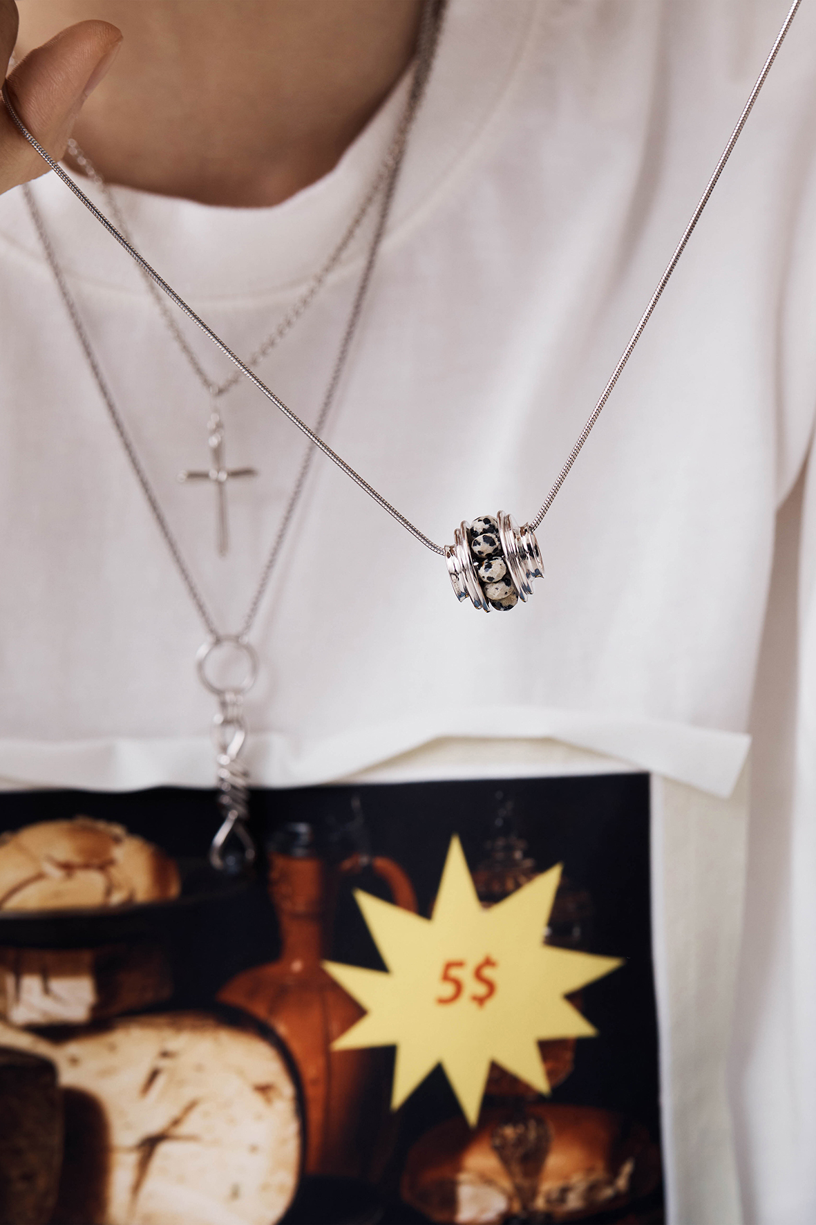 Material : Rodium plated sterling silver, Dalmatian jasper