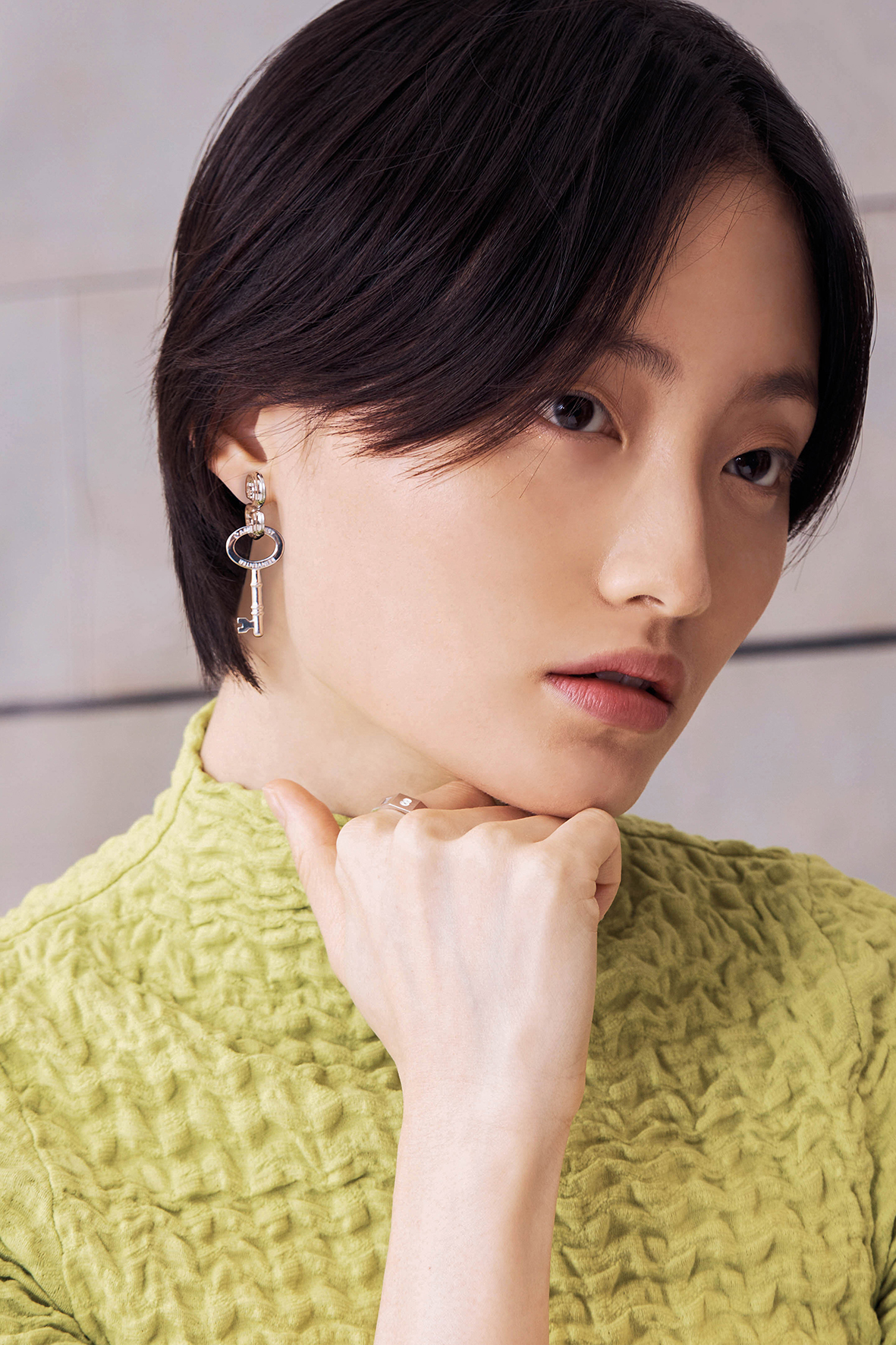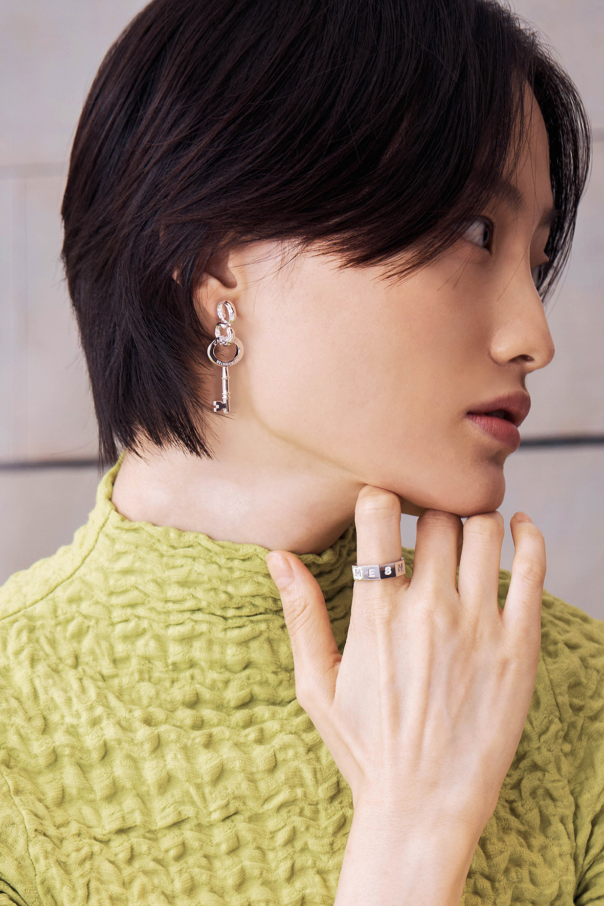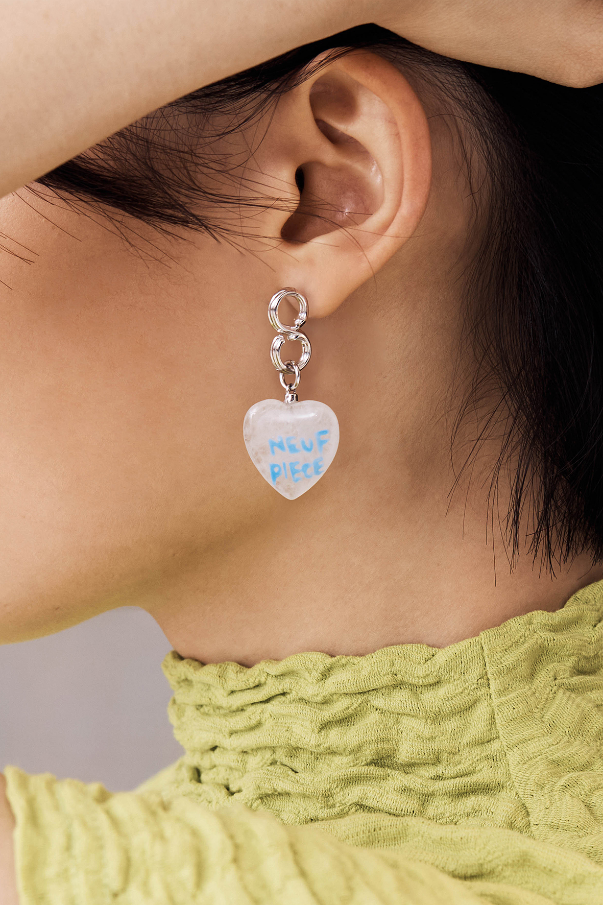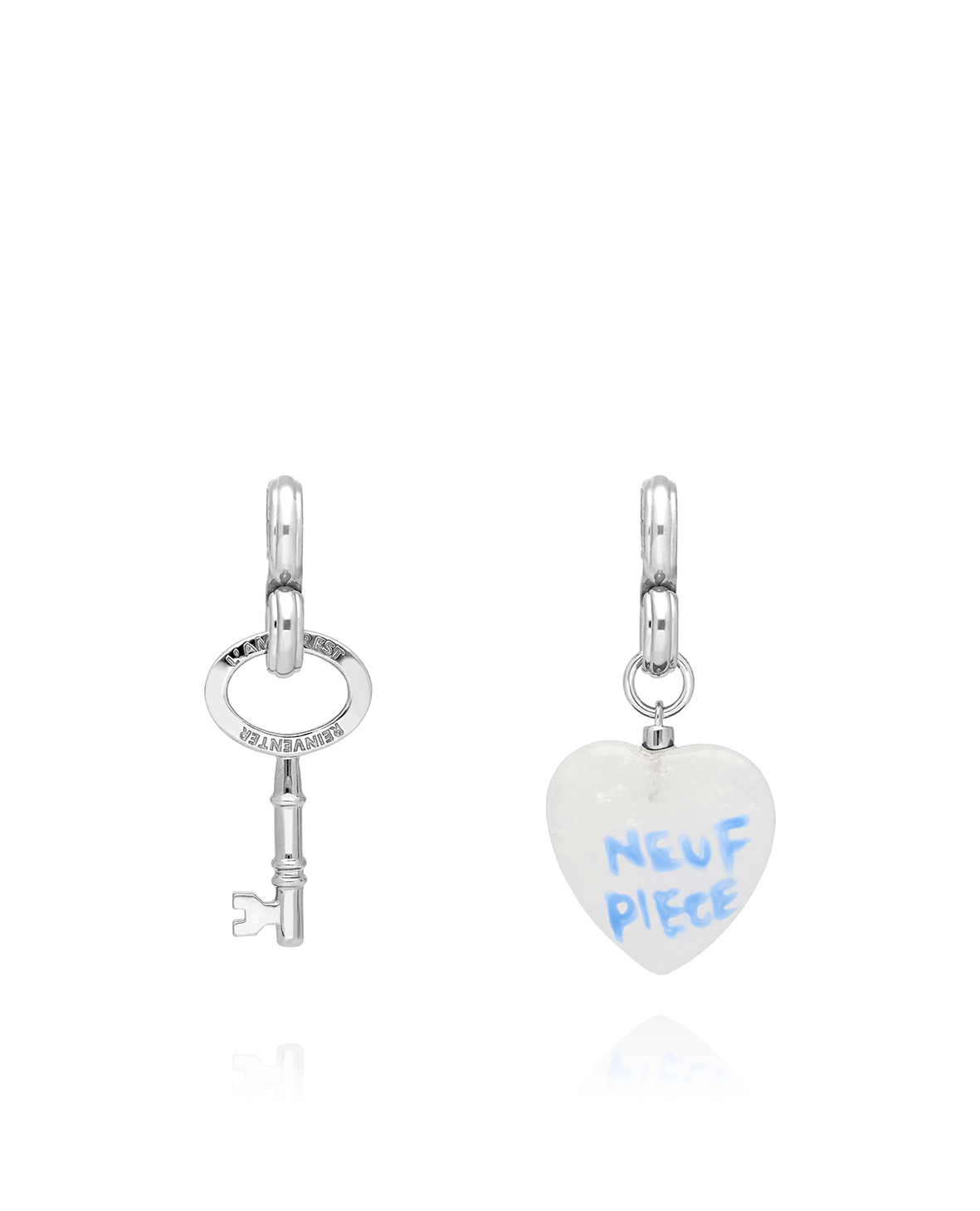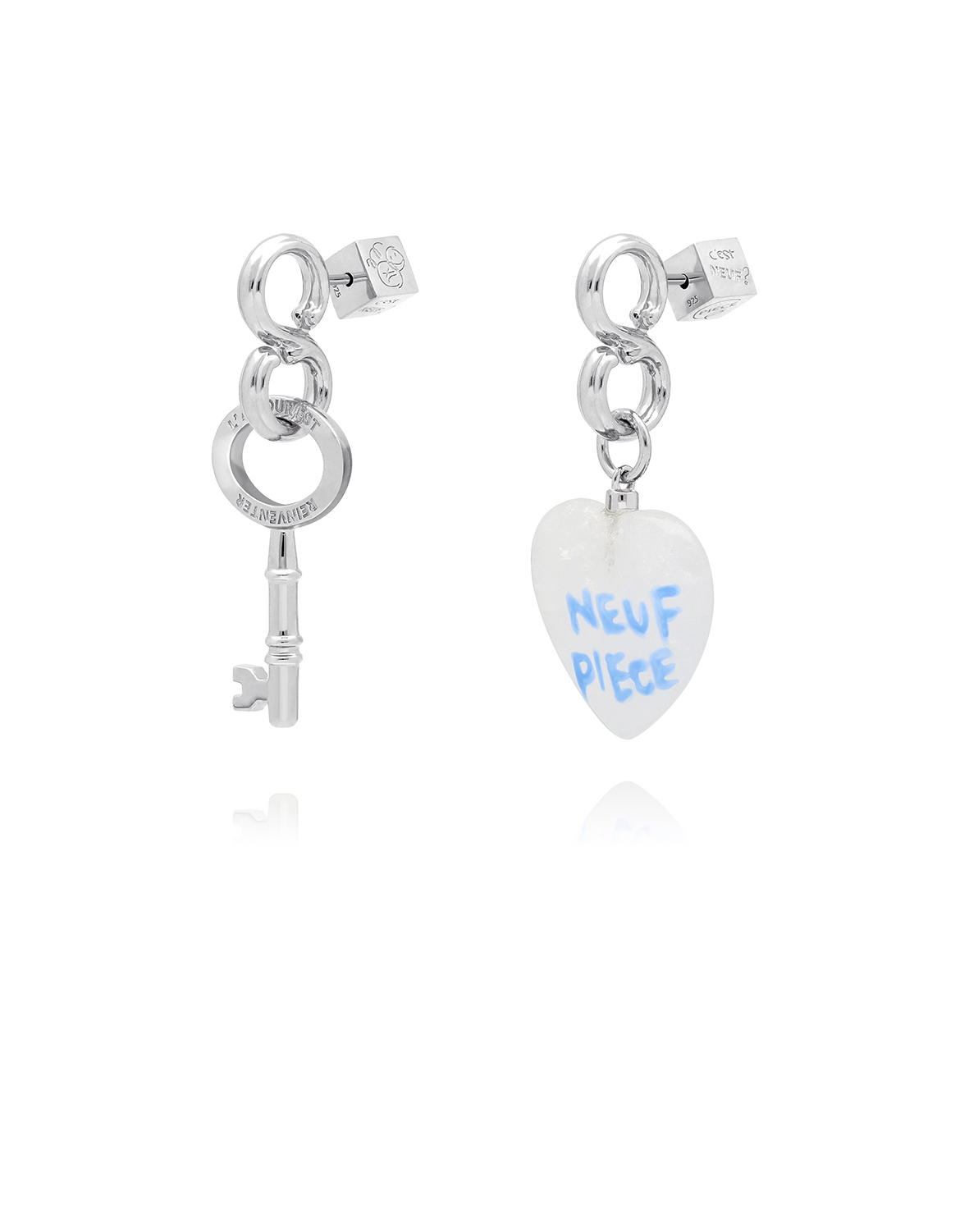 L' AMOUR EST REINVENTER(사랑은 재발견이다)가 각인된 열쇠와 밀키 쿼츠 하트에 페인팅 된 NEUF PIECE 낙서가 매력적인 언발란스 이어링.